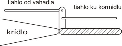 obr. 3 Ďalší spôsob ovládania, je pomocou tretieho lanka. Lanko musí vychádzať z trupu za osou vahadla, aby pri ovládaní nestáčalo model do kruhu. Druhý koniec je prichytený na rukoväti. Vďaka tomu, že lanko je napínané odporom vzduchu, musí byť ovládací mechanizmus držaný neustále v predpätí pomocou pružiny, ktorá zamedzuje jeho predčasné spustenie. Takýto mechanizmus je vhodný na ovládanie odhodenia bômb, ovládanie podvozku, prípadne ku spúšťaniu programového kotúča vo vnútri trupu, ktorý aktivuje jednotlivé funkcie ovládané mechanizmami. Nehodí sa však na ovládanie otáčok motora a klapiek. Na to je vhodnejší spôsob, ktorý nepotrebuje predpínaciu pružinu, nevadí mu odstredivá sila a je ním možné ovládať otáčky motora aj na modeli stojacom na zemi. Vyššie spomenuté požiadavky spĺňajú mechanizmy s posuvným alebo dvojitým, prípadne trojitým vahadlom.
