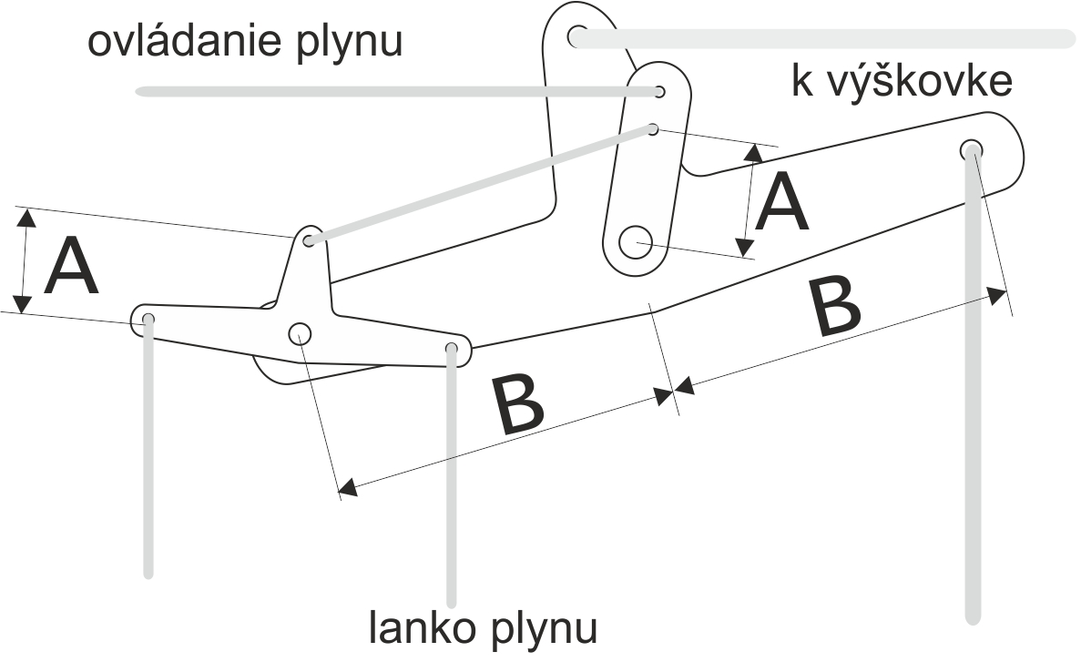 Pri ovládaní výškovky lankami 1a 2 sa nepohybuje lanko 3 a nemení sa teda nastavenie otáčok motora. Pritiahnutím, alebo povolením lanka 3 sa nemení vzájomné nastavenie laniek 1 a 2 , iba sa posunie pomocným vahadlom hlavné vahadlo a zmení sa nastavenie motora, a to bez zmeny nastavenia výškovky. Všetky lanká sú za letu zaťažené rovnakou silou, čo je dané geometrickou podmienkou vzdialeností otvorov na pomocnom vahadle. Posuv lanka 3 je rovný približne dvojnásobku posuvu laniek 1 a 2. Schéma rukoväte pre toto riadenie je na obrázku 6.