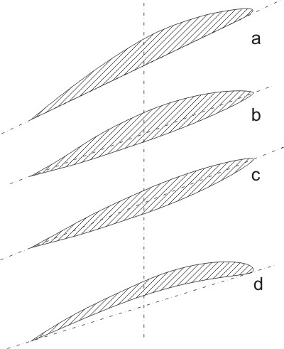 Podobne ako krídlo, má vrtuľa vo všetkých svojich rezoch, s výnimkou vymedzenej strednej časti, aerodynamické tvary, ktoré vytvárajú pri daných pomeroch čo najväčší vztlak a najmenší odpor. Obvykle ide o tvary málo odlišné od bežných profilov používaných na krídlach modelov. Neznamená to však, že všetky profily sú vhodné pre všetky vrtule bez ohľadu na ich používanie v rôznych podmienkach. Na obrázku 1, sú znázornené tri najpoužívanejšie druhy profilov vrtule. Je to profil s rovnou spodnou stranou (1a), profil asymetrický s malým prehnutím (1b) a nakoniec profil súmerný (1c). Profily s klenutou spodnou stranou (1d) sú málo vhodné, s výnimkou snáď halových modelov, pretože majú pri nižších súčiniteľoch vztlaku, pri ktorých vrtule pracujú, väčší odpor.